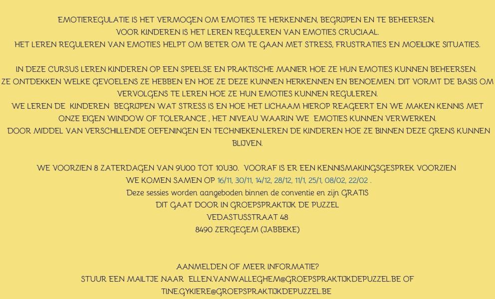 Ze ontdekken welke gevoelens ze hebben en hoe ze deze kunnen herkennen en benoemen. Dit vormt de basis om vervolgens te leren hoe ze hun emoties kunnen reguleren.We leren de kinderen begrijpen wat stress is en hoe het lichaam hierop reageert en we maken kennis met Onze eigen Window of Tolerance , het niveau waarin we emoties kunnen verwerken. Door middel van verschillende oefeningen en technieken.leren de kinderen hoe ze binnen deze grens kunnen blijven.