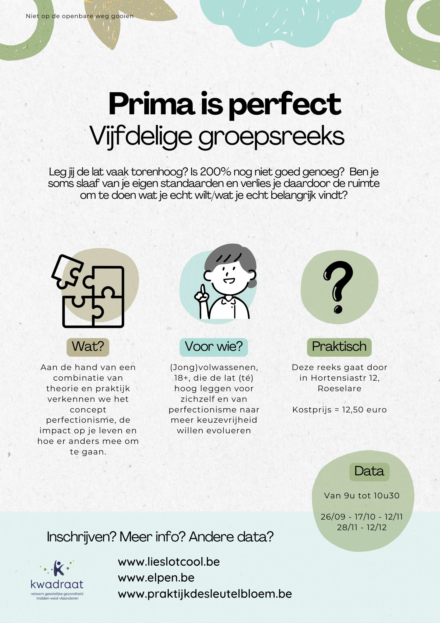 Leg jij de lat vaak torenhoog? Is 200% nog niet goed genoeg? Hindert je perfectionisme je in je je dagelijks leven? Dan is dit groepsaanbod iets voor jou!