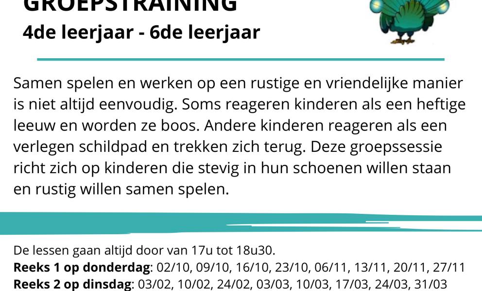 Deze groepsessie richt zich op kinderen die sterk in hun schoenen willen staan en rustig samen willen spelen als een trotse pauw. Daarnaast leer je ook opkomen voor jezelf en hoe je met vervelende situaties kan leren omgaan op een goede manier.